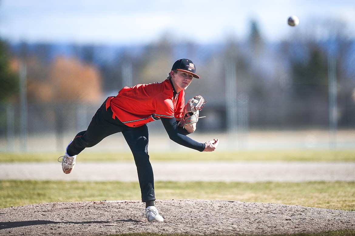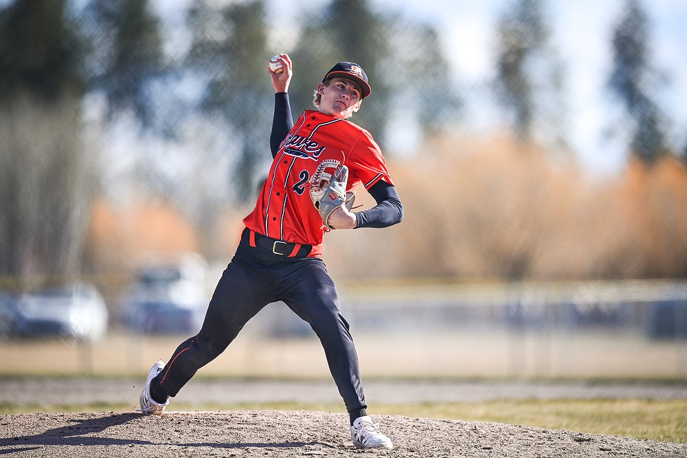 Flathead pitcher Miles Arrowsmith (2) delivers in the fourth inning against East Helena at ABS Park on Thursday, March 26. (Casey Kreider/Daily Inter Lake)