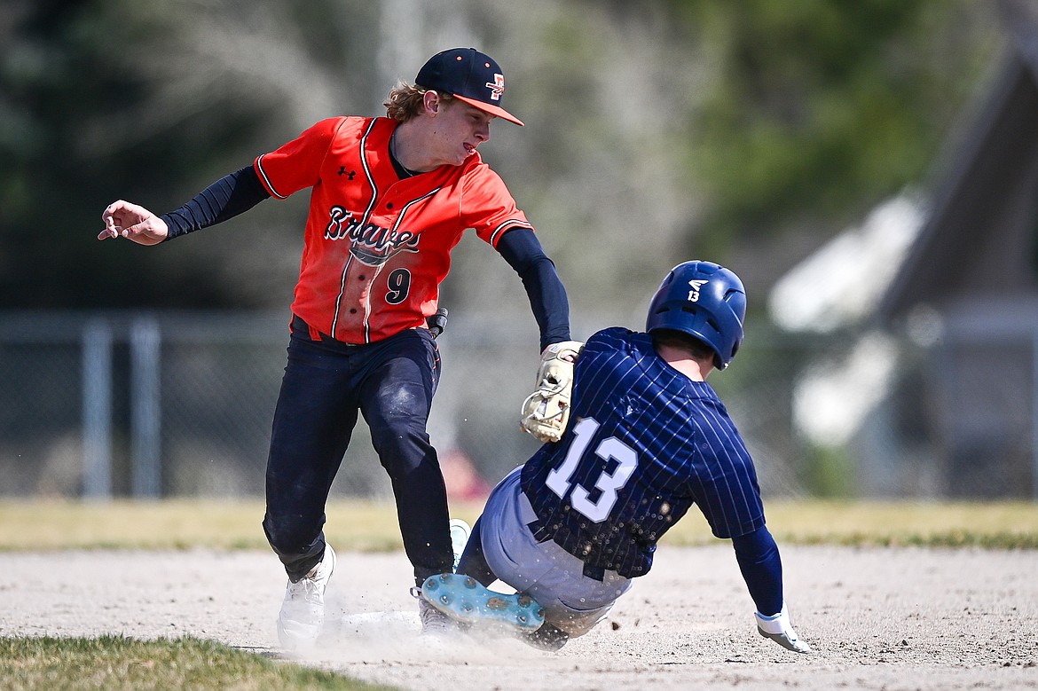 Flathead shortstop Micah Engle (9) puts the tag on East Helena's Kash Walker (13) trying to steal second base in the second inning at ABS Park on Thursday, March 26. (Casey Kreider/Daily Inter Lake)