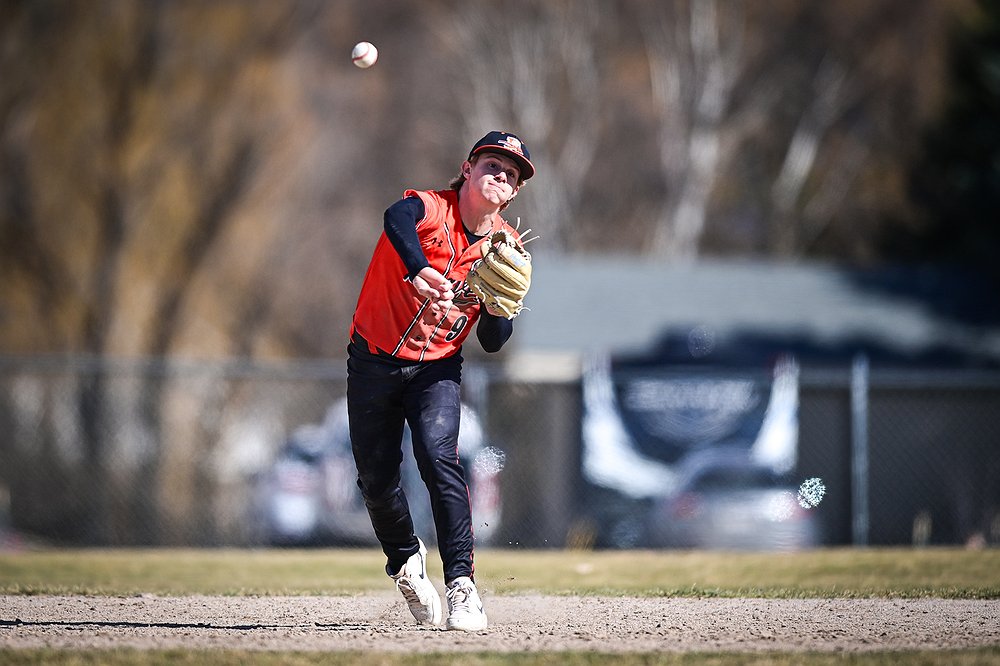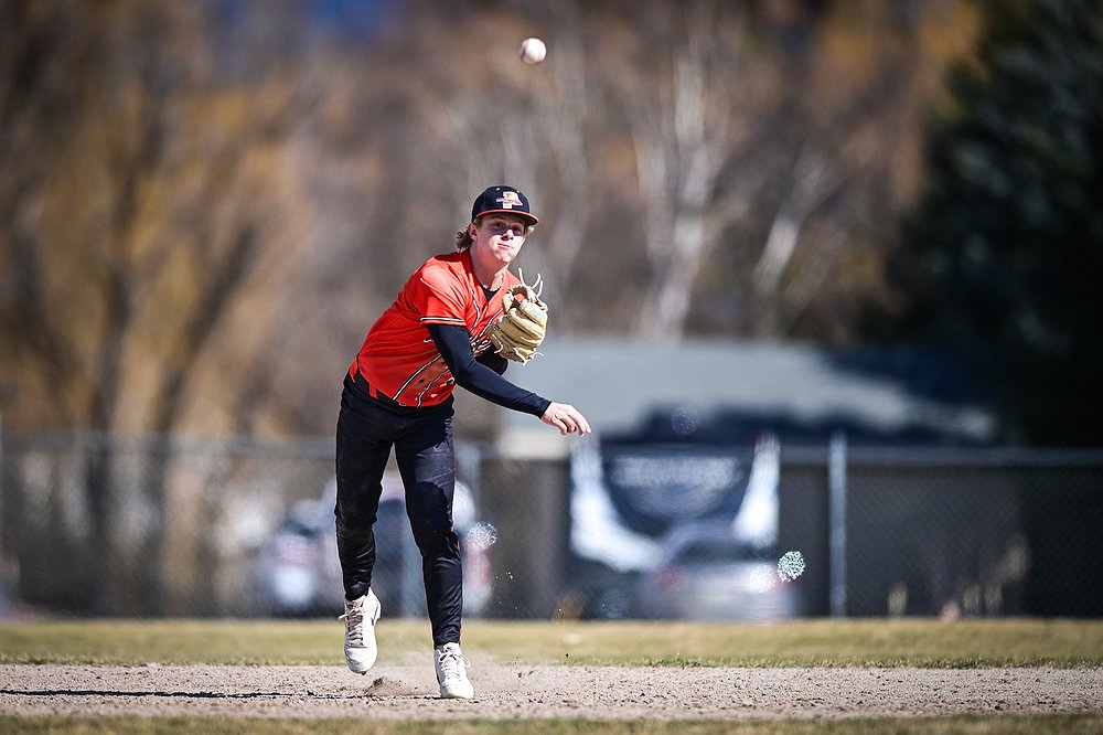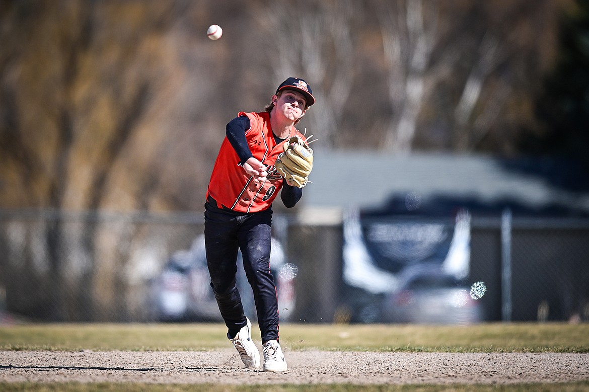 Flathead shortstop Micah Engle (9) throws to first after fielding a ground ball in the second inning against East Helena at ABS Park on Thursday, March 26. (Casey Kreider/Daily Inter Lake)