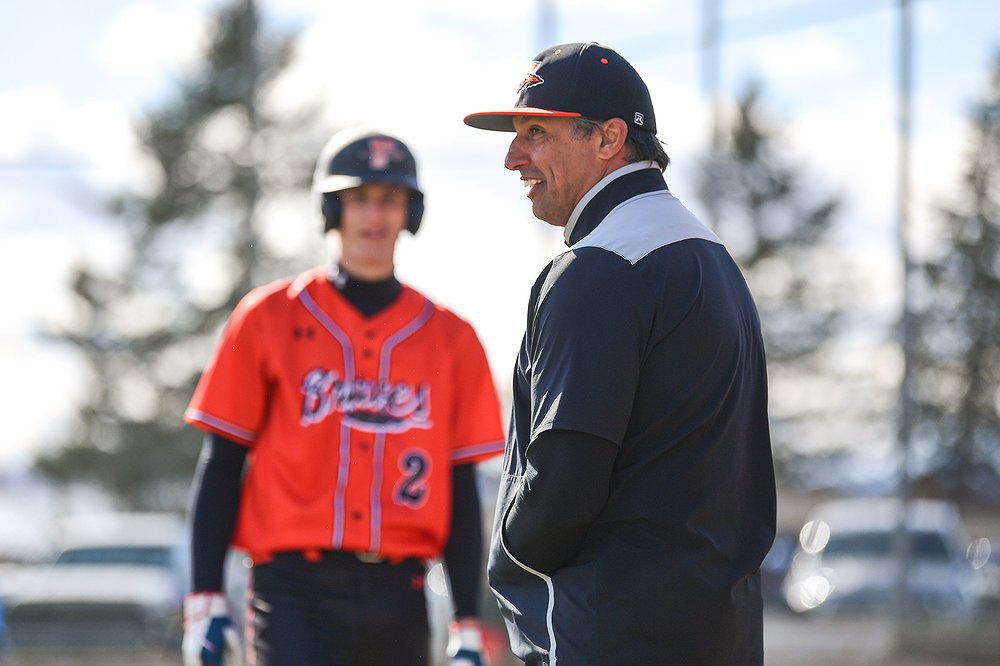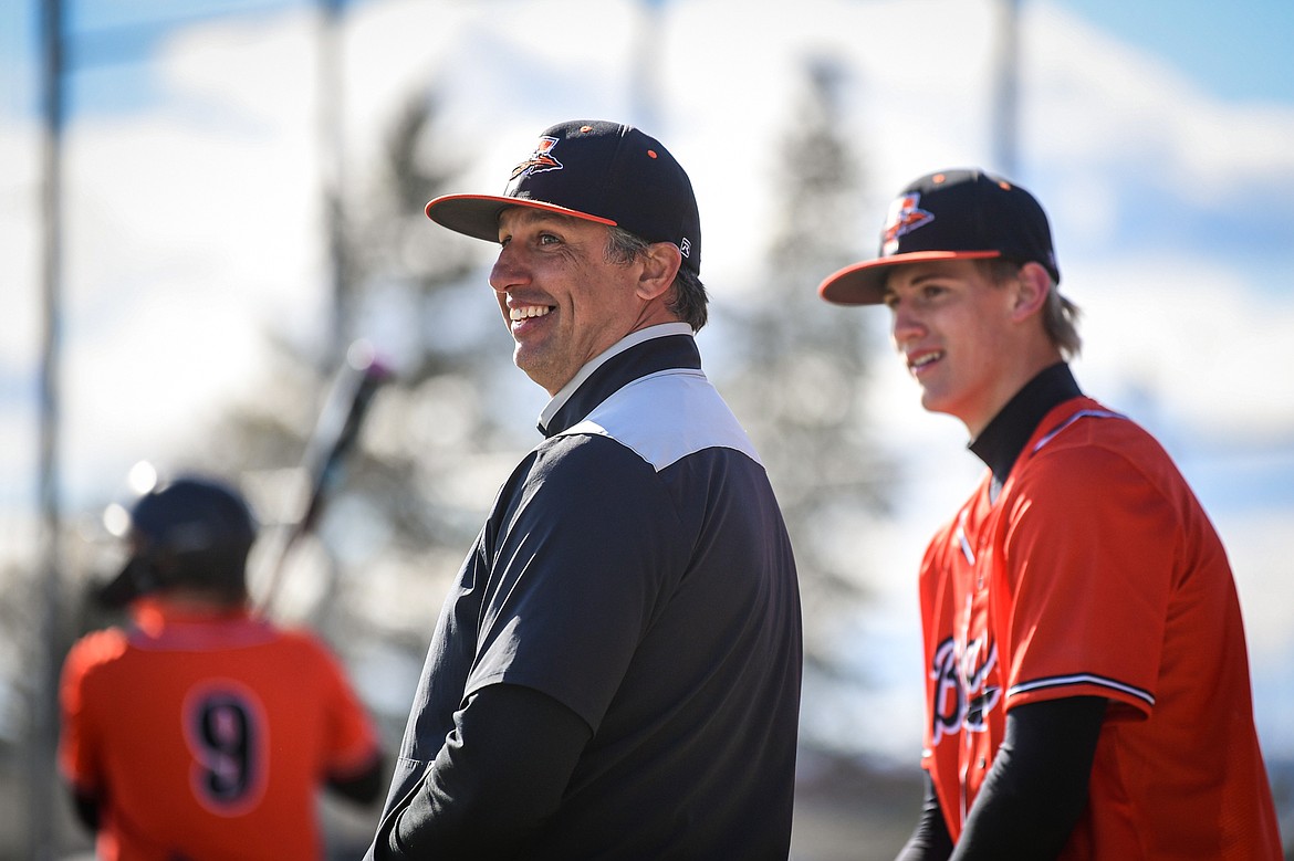 Flathead head baseball coach Rich Burland talks with Miles Arrowsmith (2) during a game against East Helena at ABS Park on Thursday, March 26. (Casey Kreider/Daily Inter Lake)