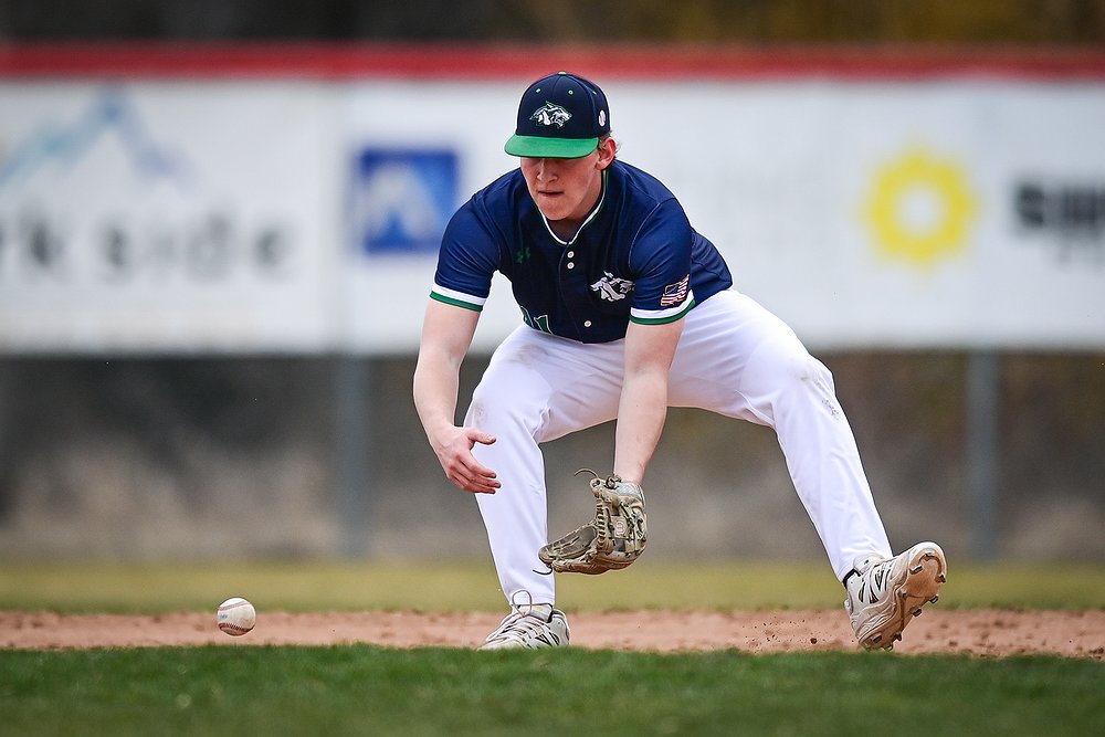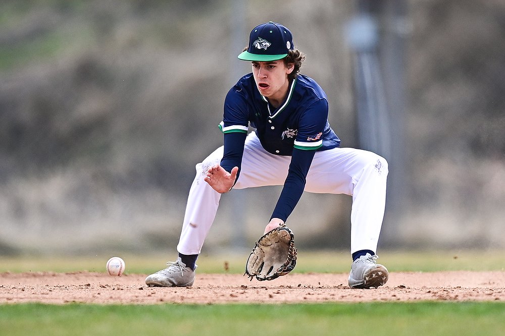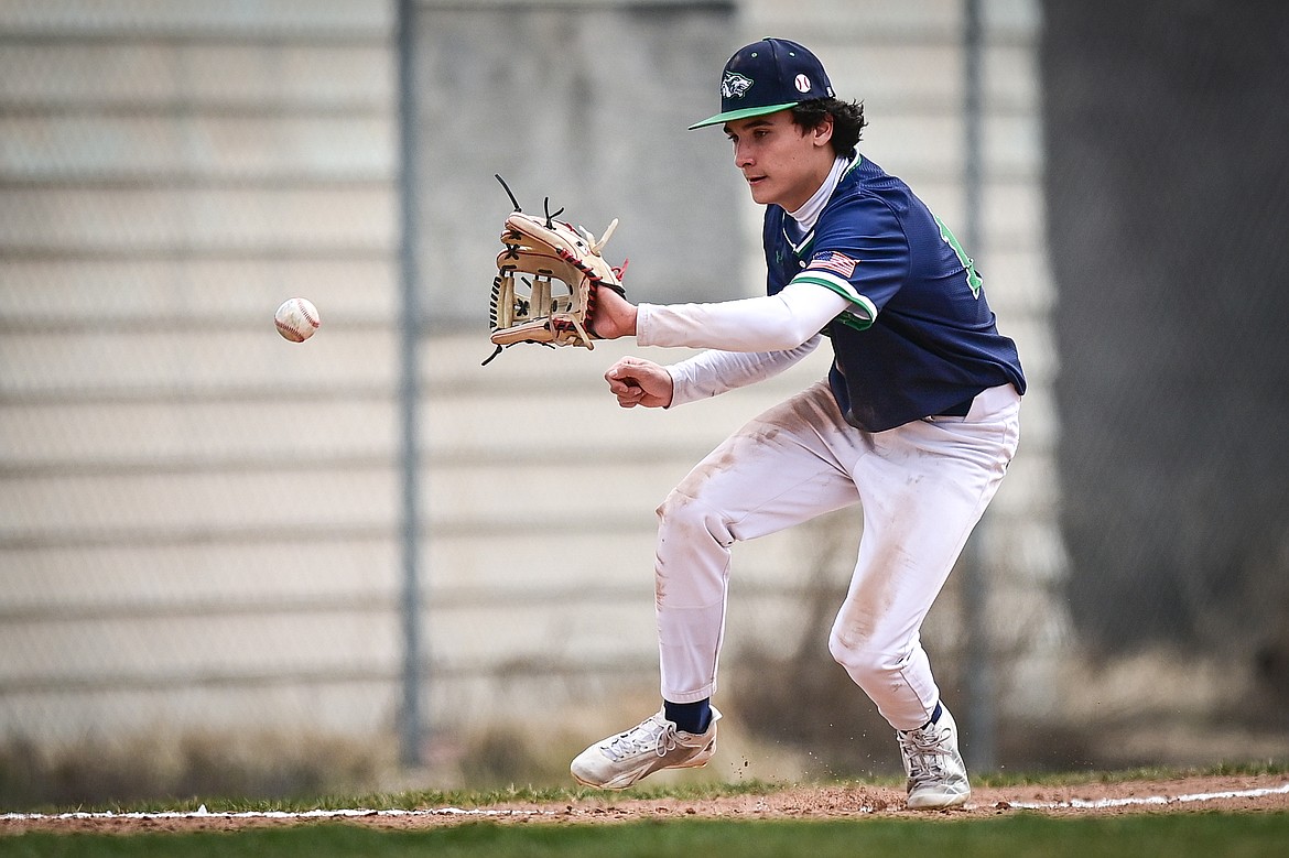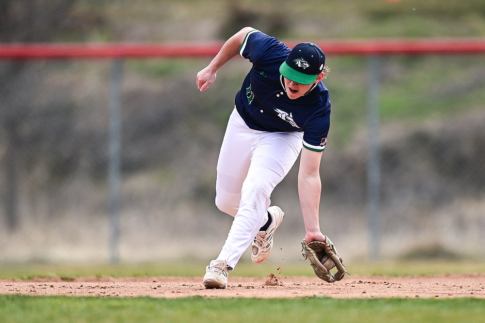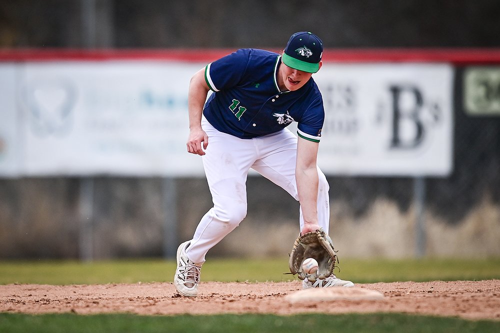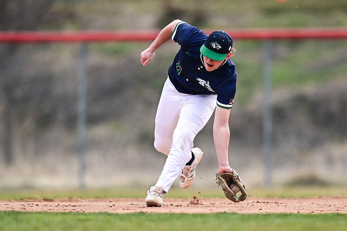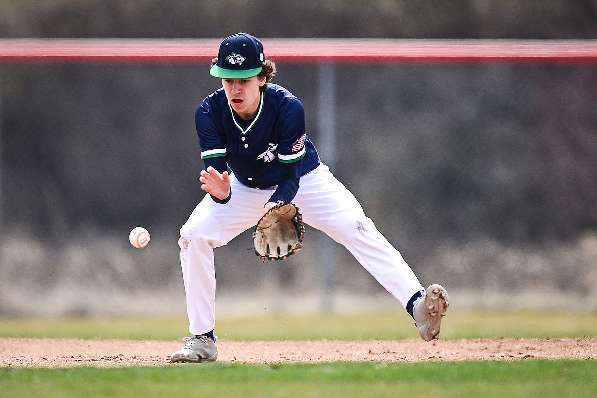 Glacier shortstop Tate Kahler (4) fields a ground ball against Belgrade at Griffin Field on Saturday, March 28. (Casey Kreider/Daily Inter Lake)