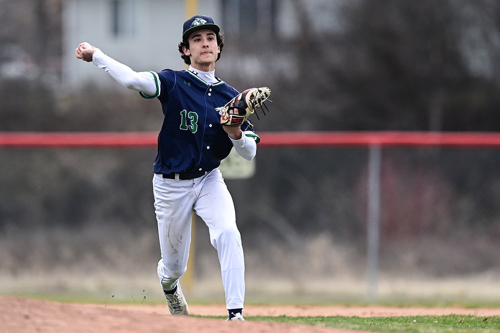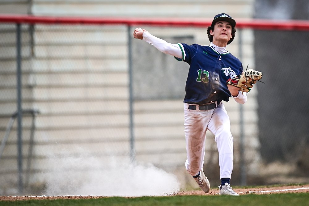 Glacier third baseman Ryne Gillette (13) throws to first against Belgrade at Griffin Field on Saturday, March 28. (Casey Kreider/Daily Inter Lake)