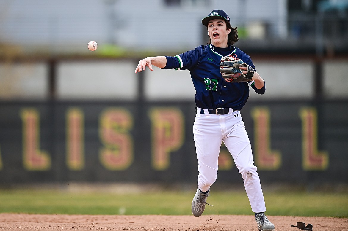 Glacier second baseman Brady Lewellen (27) throws to first after fielding a ground ball against Belgrade at Griffin Field on Saturday, March 28. (Casey Kreider/Daily Inter Lake)