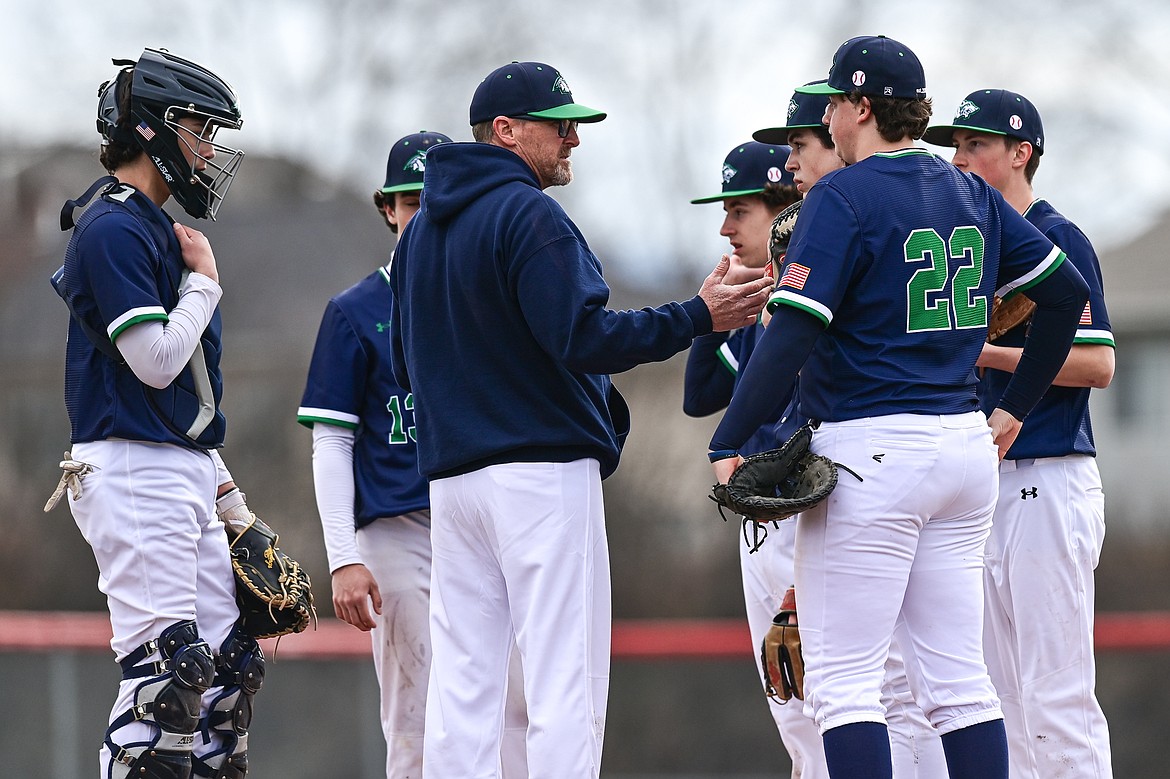 Glacier head coach Erik Brink talks to his defense during a mound meeting against Belgrade at Griffin Field on Saturday, March 28. (Casey Kreider/Daily Inter Lake)