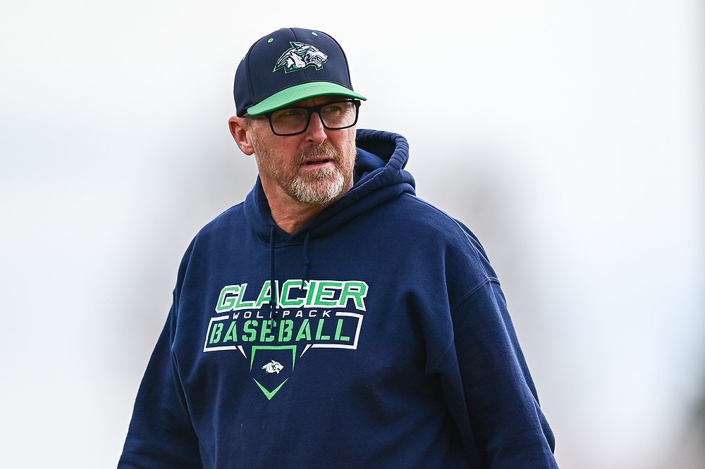 Glacier head coach Erik Brink walks back to the dugout after a meeting on the mound against Belgrade at Griffin Field on Saturday, March 28. (Casey Kreider/Daily Inter Lake)