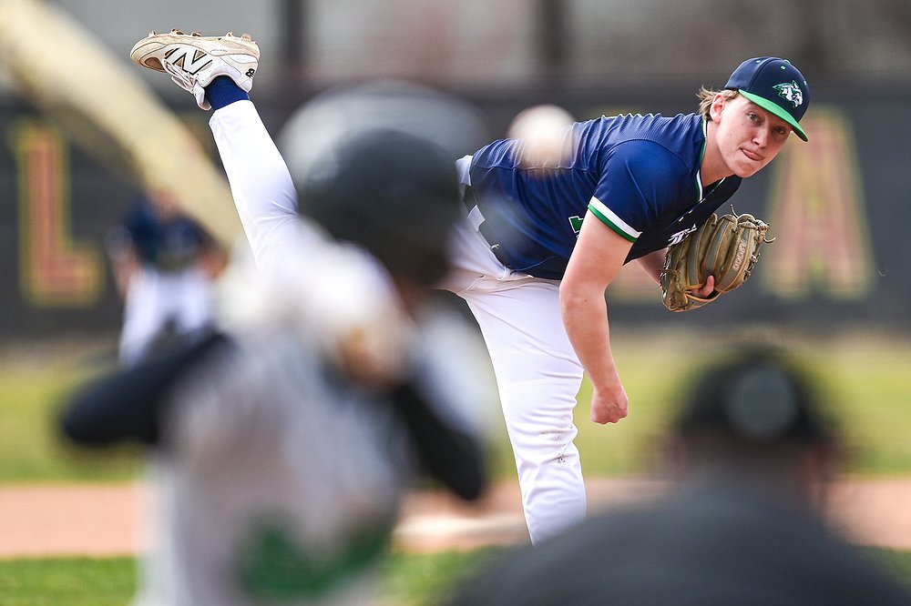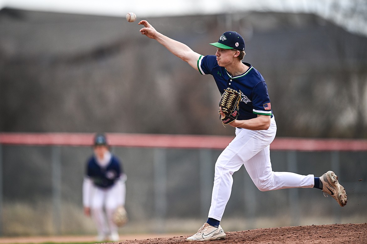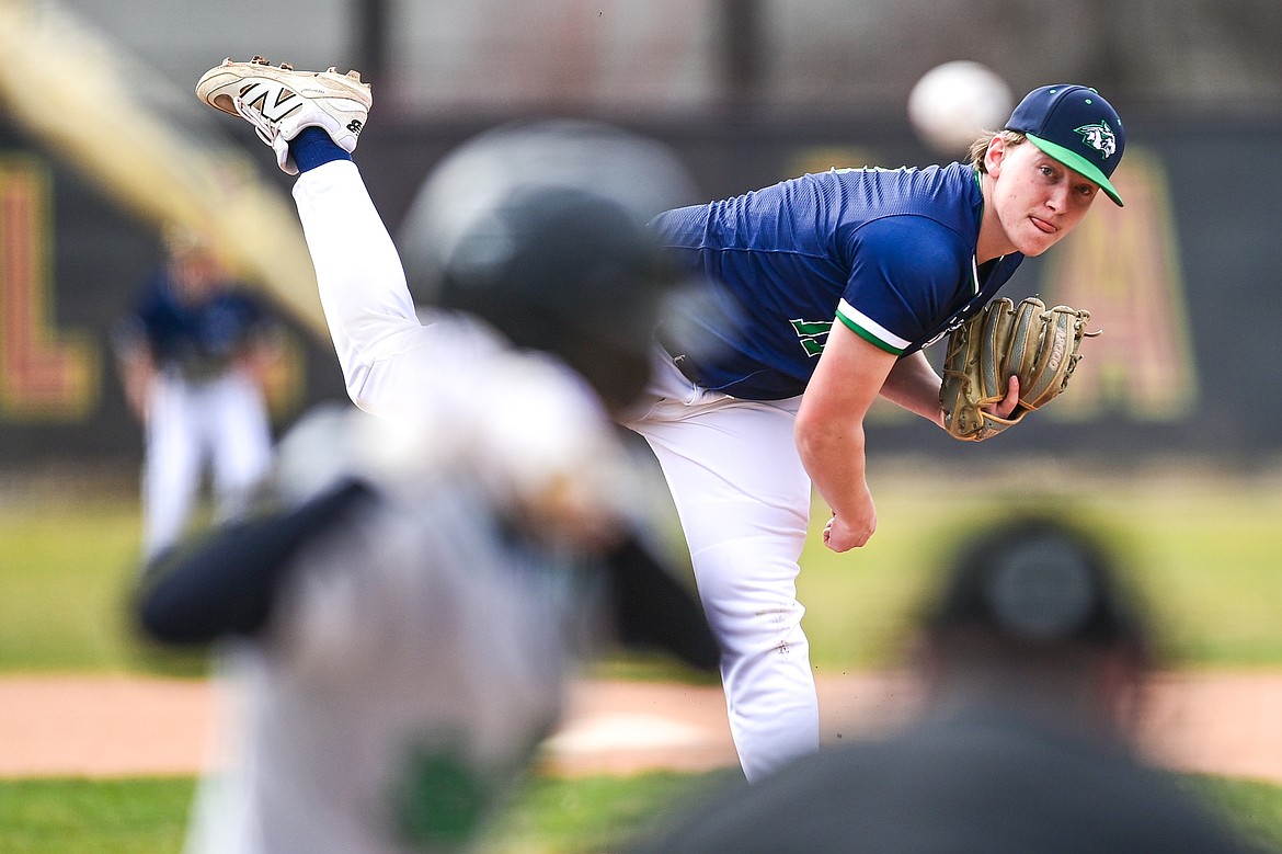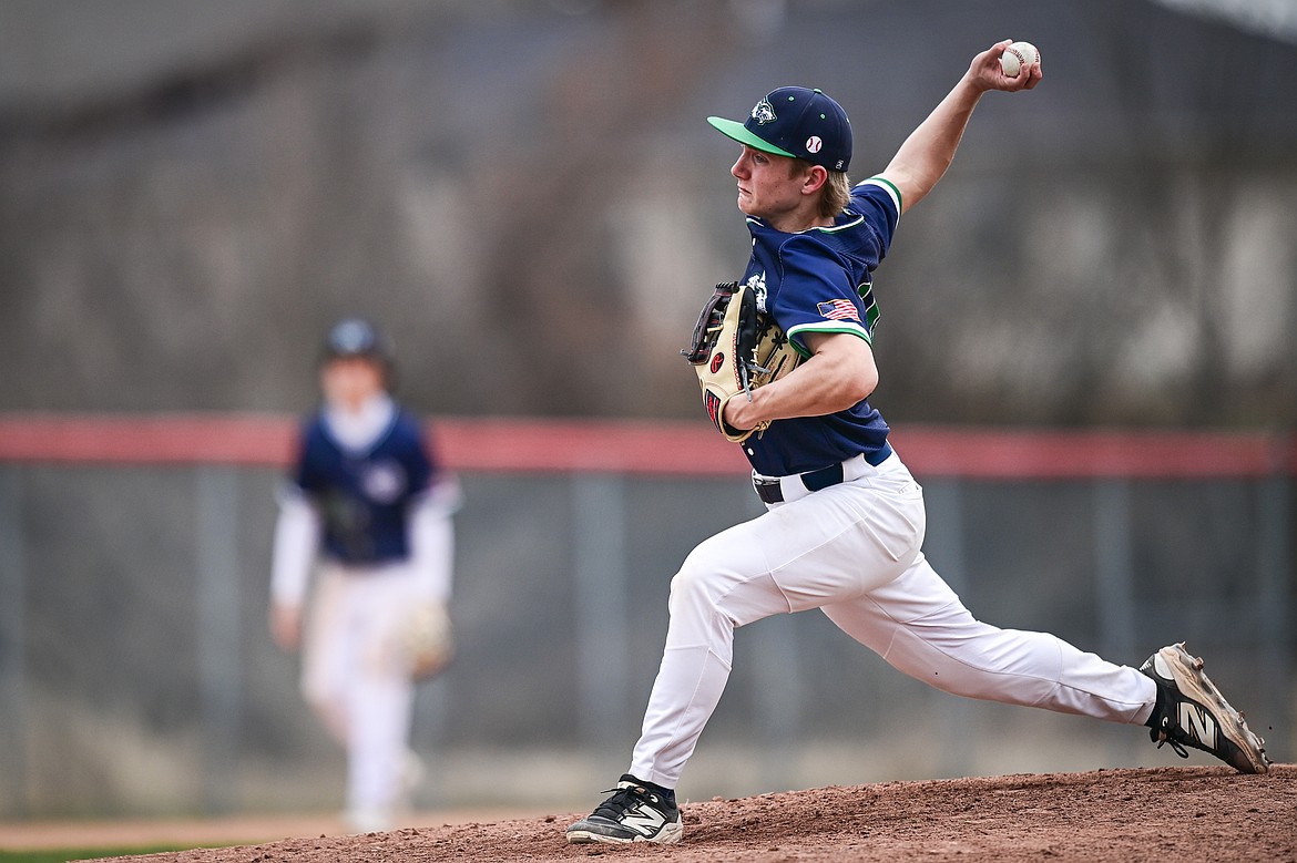 Glacier pitcher Wyatt Sharp (8) delivers against Belgrade at Griffin Field on Saturday, March 28. (Casey Kreider/Daily Inter Lake)
