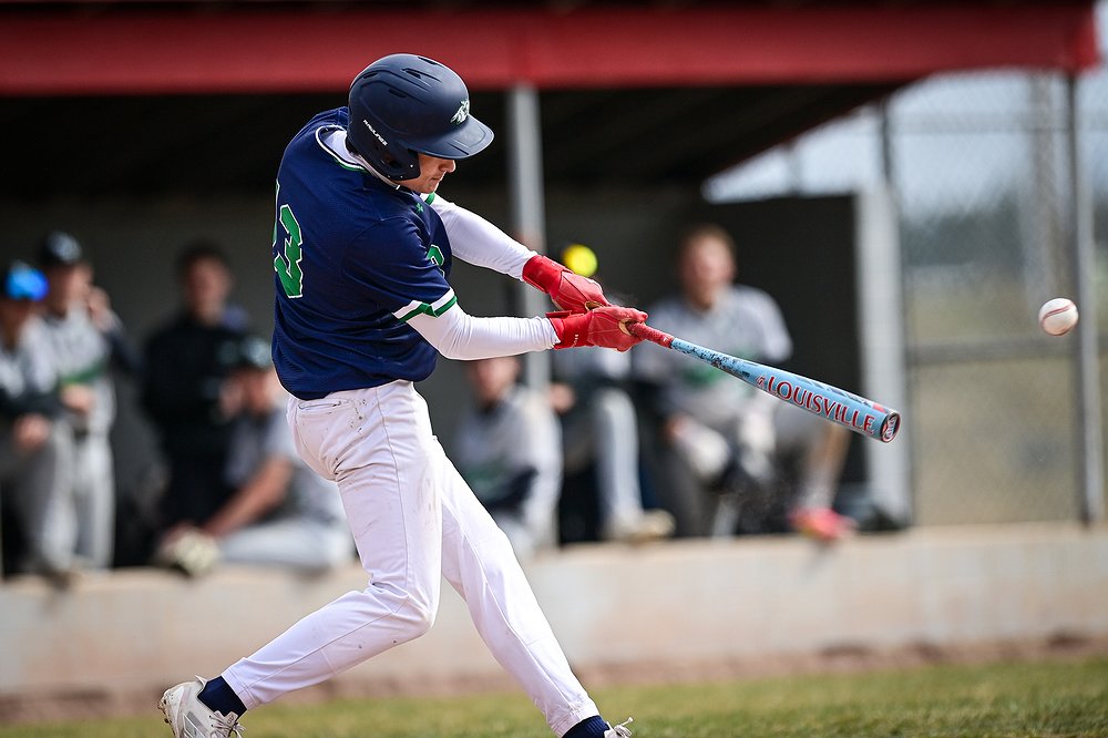 Glacier's Kaeden Kahler (22) drives in a run with a single in the sixth inning against Belgrade at Griffin Field on Saturday, March 28. (Casey Kreider/Daily Inter Lake)
