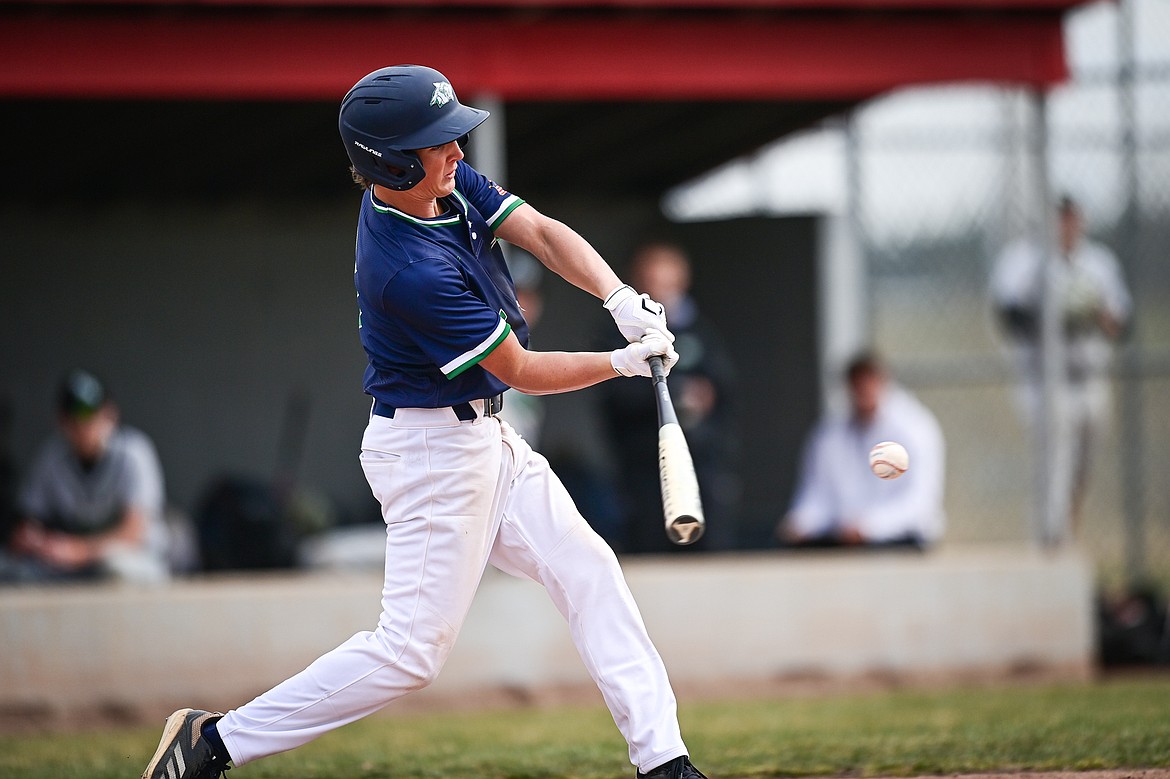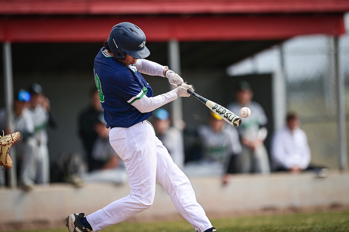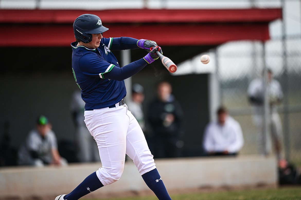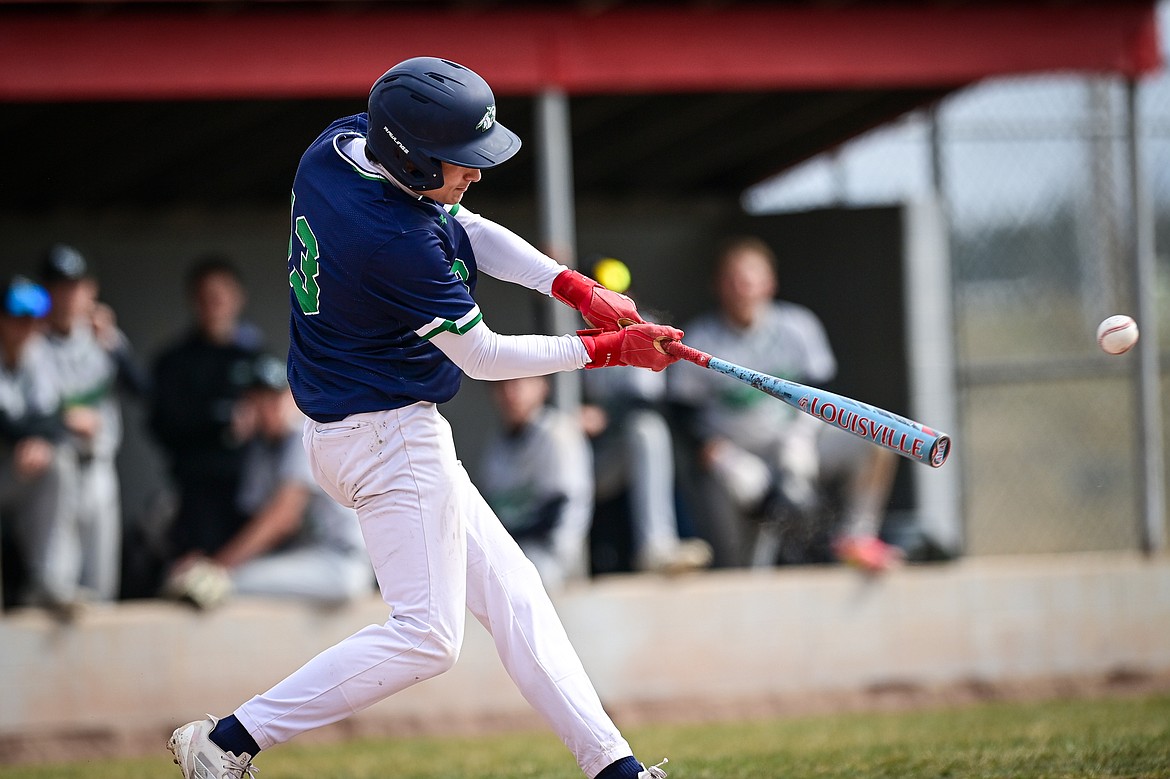 Glacier's Ryne Gillette (13) connects on a single in the fifth inning against Belgrade at Griffin Field on Saturday, March 28. (Casey Kreider/Daily Inter Lake)