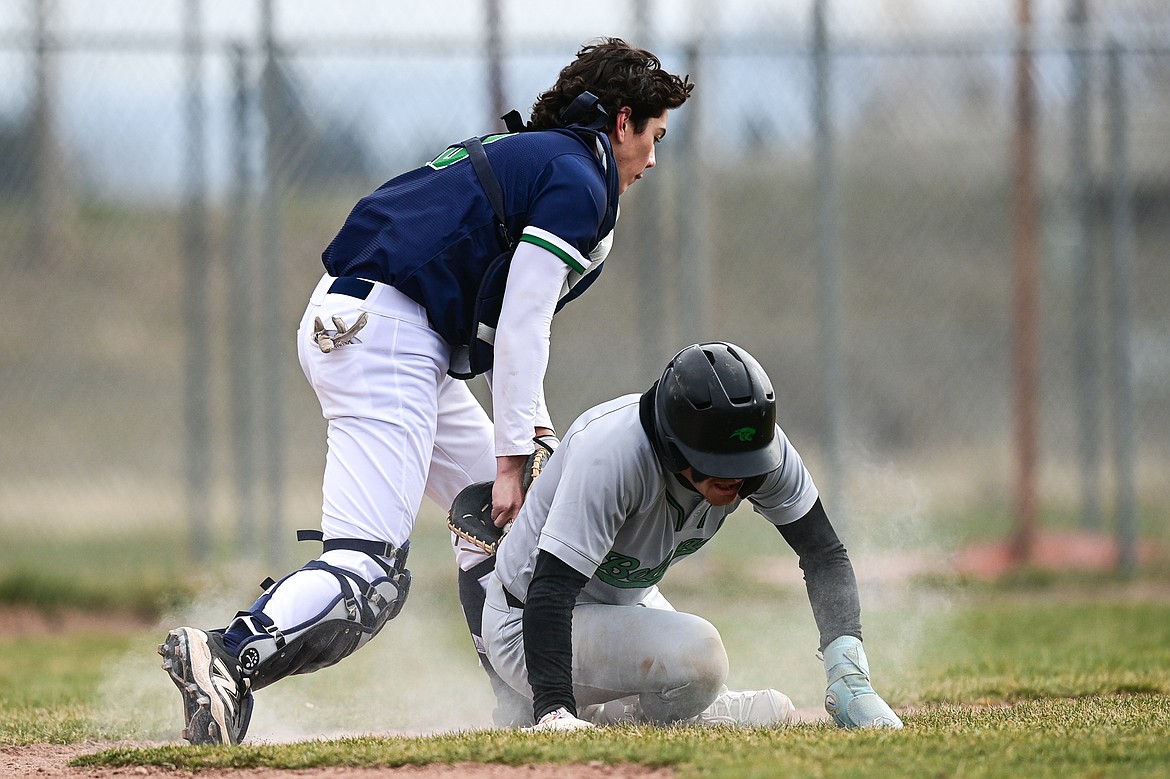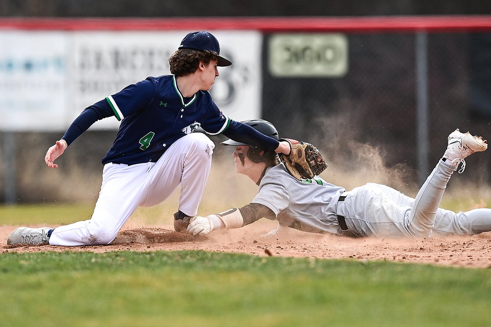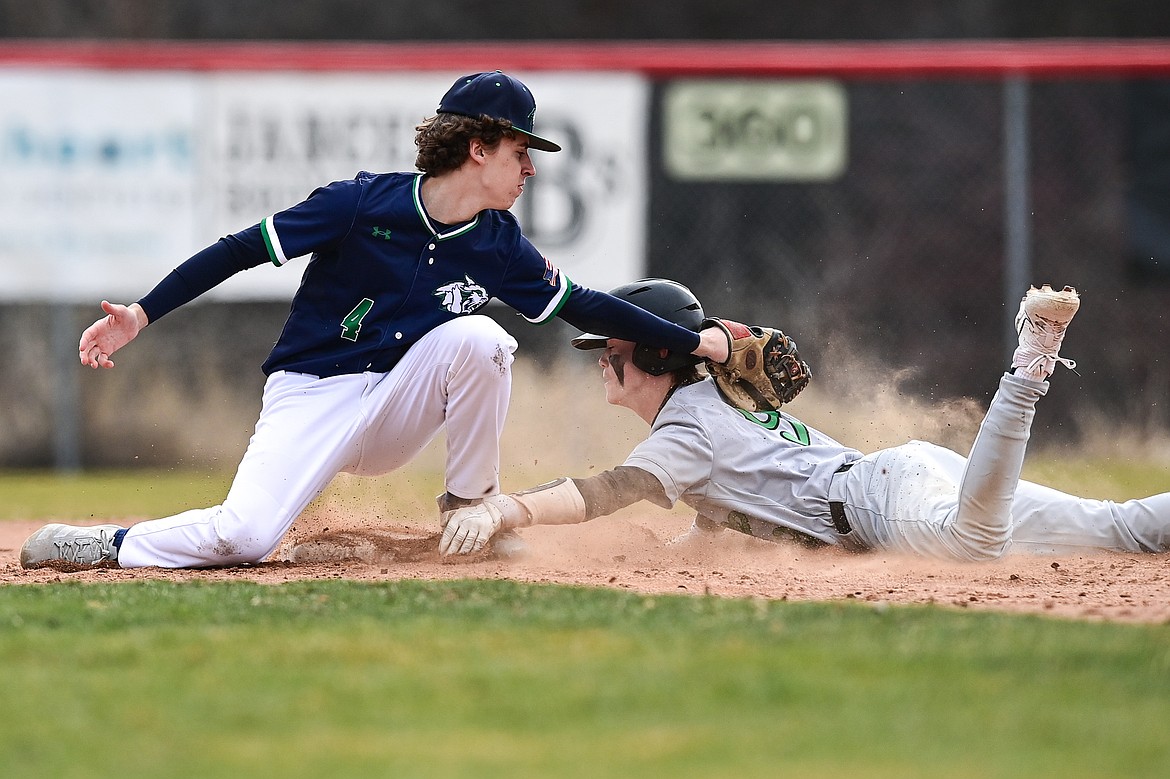 Glacier shortstop Tate Kahler (4) tags Belgrade's Chance Stephens (9) as Stephens hand comes off the bag while trying to steal second base at Griffin Field on Saturday, March 28. (Casey Kreider/Daily Inter Lake)