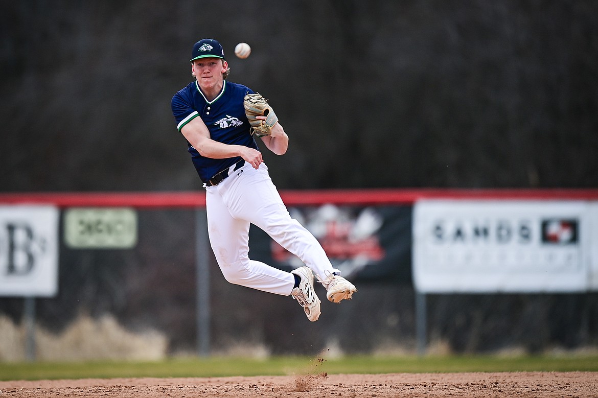Glacier shortstop Tate Kahler (4) throws to first after making a play on a ground ball against Belgrade at Griffin Field on Saturday, March 28. (Casey Kreider/Daily Inter Lake)