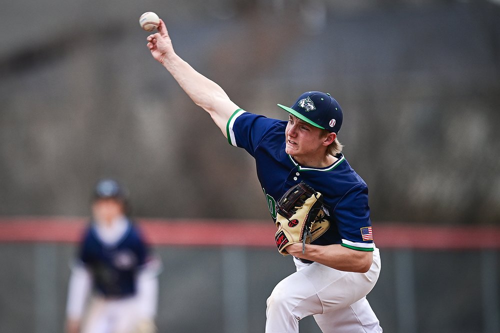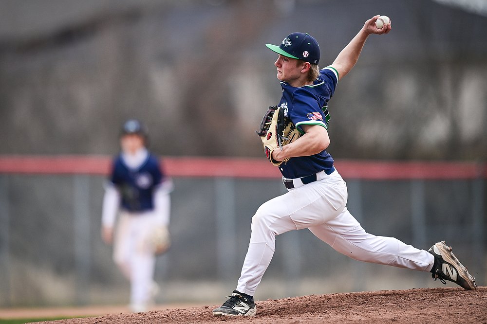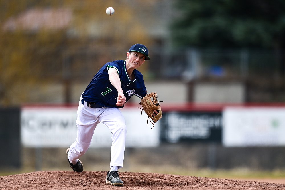 Glacier pitcher Max Weber (10) delivers against Belgrade at Griffin Field on Saturday, March 28. (Casey Kreider/Daily Inter Lake)
