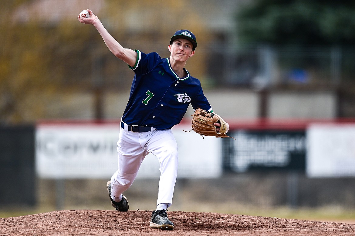 Glacier pitcher Beau Schulz (7) delivers in the third inning against Belgrade at Griffin Field on Saturday, March 28. (Casey Kreider/Daily Inter Lake)