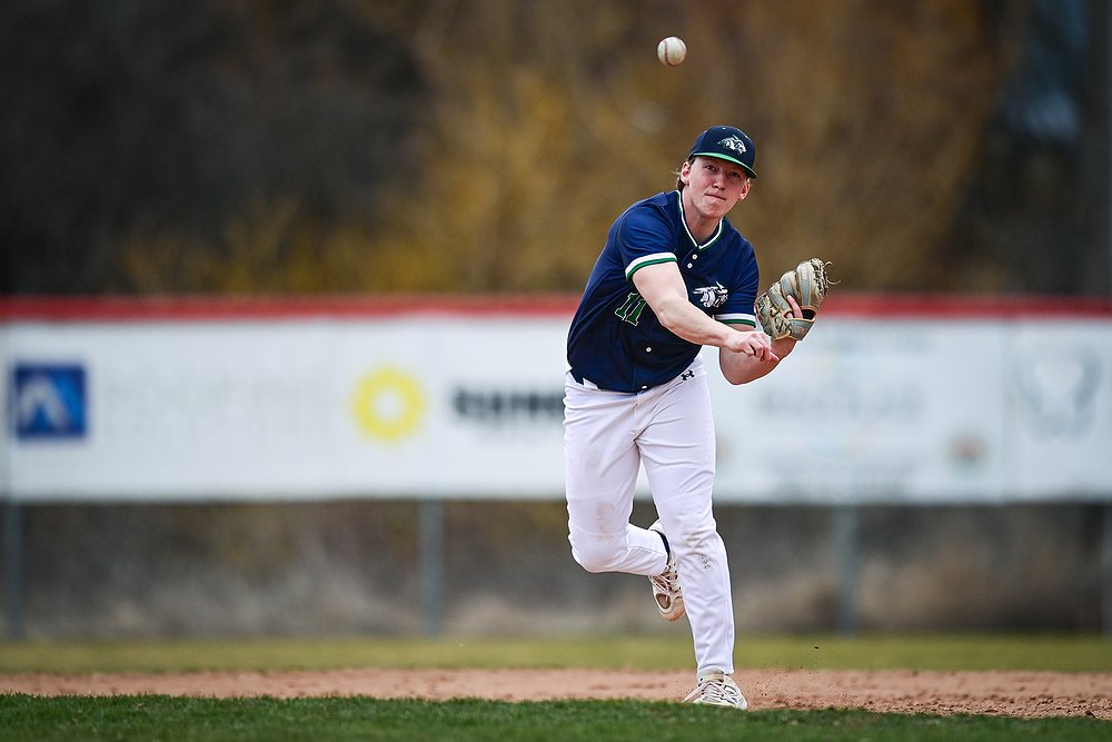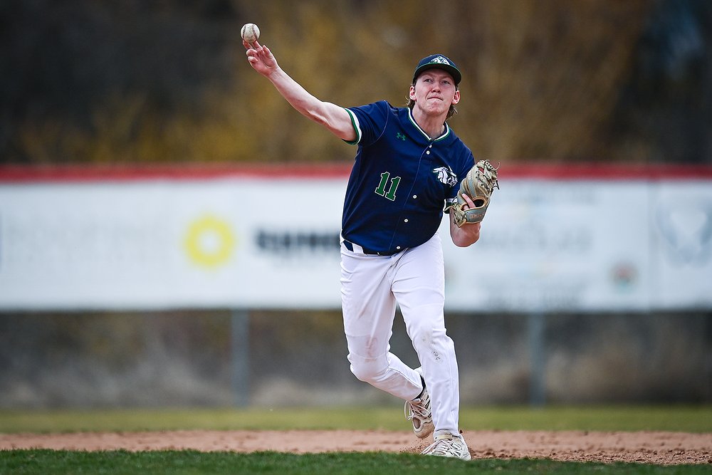 Glacier shortstop Kyler Croft (11) throws to first after making a play on a ground ball against Belgrade at Griffin Field on Saturday, March 28. (Casey Kreider/Daily Inter Lake)