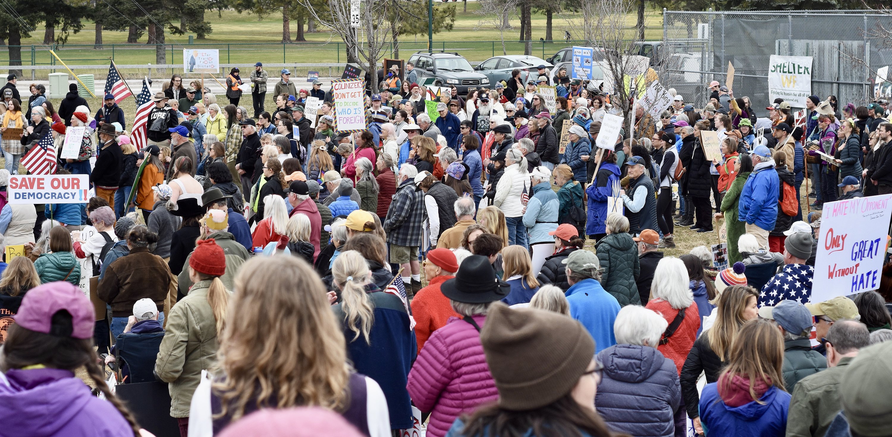 People attend the No Kings rally organized by Flathead Democracy at Grouse Mountain Fields in Whitefish on Saturday, March 28, 2026. Events were held in all 50 states to protest the Trump administration. (Matt Baldwin/Daily Inter Lake)