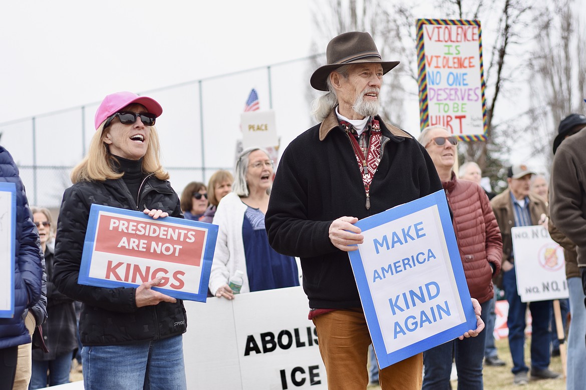 A No Kings protest against the Trump administration drew hundreds of people to Grouse Mountain Fields in Whitefish on Saturday, March 28, 2026. The event, hosted by Flathead Democracy, was one of thousands held across the U.S., according to national event organizers.