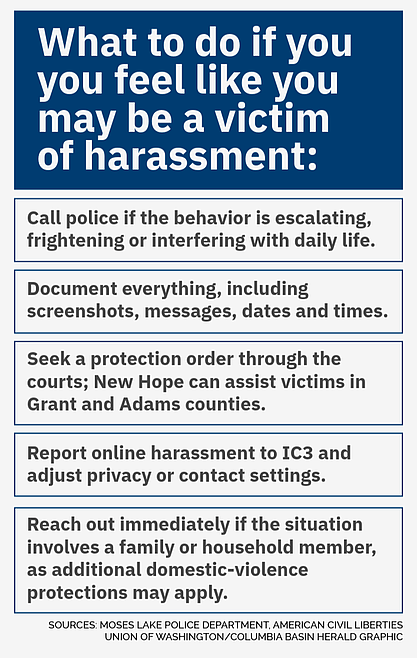 MOSES LAKE — Local law enforcement officials say anyone who feels they are being harassed – whether online, by a neighbor or by someone they know – should reach out to police early, even if the behavior does not yet meet the threshold for a criminal charge under Washington law.