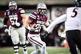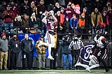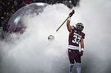 Linebacker Carson Rostad (33) leads the Grizzlies onto the field before their FCS playoff game …