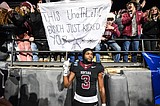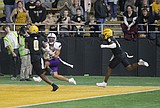 Grizzlies safety TraJon Cotton (3) points to a sign in the stands after a 35-28 …