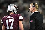 Grizzlies head coach Bobby Hauck speaks with safety Robby Hauck (17), his son, during the …