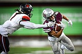 Grizzlies wide receiver Aaron Fontes (14) motions for a first down after a 12-yard reception …