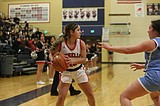 Moses Lake senior Marissa Bischoff, left, moves the ball up the floor against West Valley …