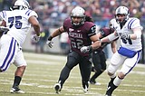 Grizzlies defenders Jayden Dawson (2), Eli Alford (91) and Henry Nuce (96) stop a run …