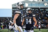 Grizzlies linebackers Caleb Otlewski (45) and Peyton Wing (32) celebrate after a stop in the …