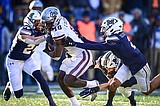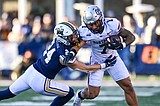 Bobcats wide receiver Taco Dowler (14) is tackled by Grizzlies cornerback Kenzel Lawler (8) on …