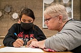 Teacher Sheryl Kohl helps line up a ruler as her student works on an art …