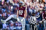 Grizzlies tight end Josh Gale (81) is tackled out of bounds after a reception in …