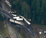 This aerial image from video provided by KOMO-TV, shows the site of an Amtrak train …