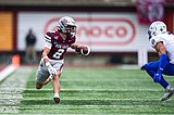 Grizzlies wide receiver Drew Deck (2) picks up yardage after a reception in the third …
