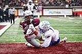 Grizzlies wide receiver Michael Wortham (6) celebrates in the end zone after a 28-yard touchdown …