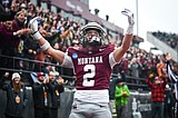 Grizzlies wide receiver Drew Deck (2) celebrates after a 29-yard touchdown reception in the third …