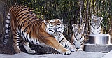 <p>Marta stretches and stays close to her twin Amur tiger cubs Viktor and Talya as …