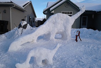 A pair of snow dinosaurs that recently popped up on Margrethe Drive in Kalispell is the culmination of a bucket, lots of packed snow and a few hours of work each day over three days.