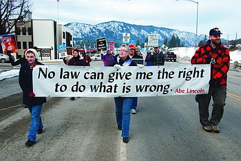 Pro-life demonstrators march down Highway 200 through the business district of Thompson Falls, on Thursday, Jan. 22.