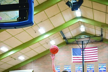 Tanner Laws, of Thompson Falls, watches as the basketball goes through the hoop during Friday night's win against Superior.