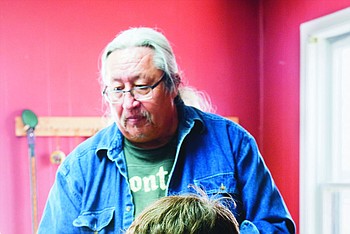 Jean Nemeth works on two fairy house carvings made from bark during the weekly Tuesday night Wood Carving Club's meeting.