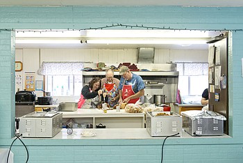 Karen Porfitt, Bobby Mayes and Dave Adams prepare the Thanksgiving dinner at the Assembly of God Church in Plains last Thursday.