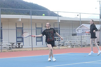 Sierra Bruning follows through her swing during the invitational tournament in Thompson Falls.