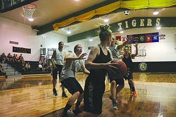 Trotters guard Kimberly Earhart looks for an open teammate during the team's tourney in St. Regis.