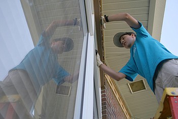 Emma Hill looks on as construction of the 4-H booth takes place last weekend at the Mineral County Fairgrounds.