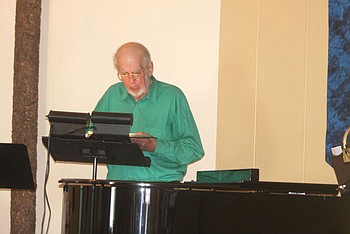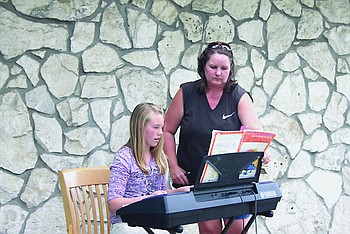 Piano teacher Heidi Mac plays the recorder while her student Audrey Brown plays the piano.