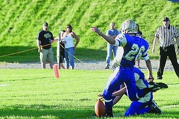 Trent Brouilette extends for the football during Plains home opener against the Whitehall Trojans on Friday evening.