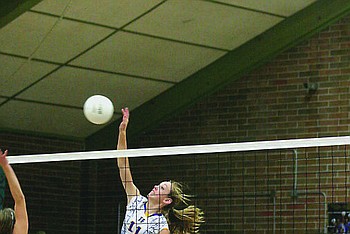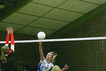 Madison Wheeler goes in to spike the ball during the game against the Polson Lady Pirates.