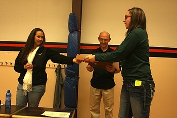 Junior varsity coach Whitney Tanner-Spurr and coach Earhart hand out an award to Jessica Hansen for the award for the most kills.