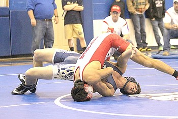 A Plains-Hot Springs wrestler gets the dominant position over his Polson competition.